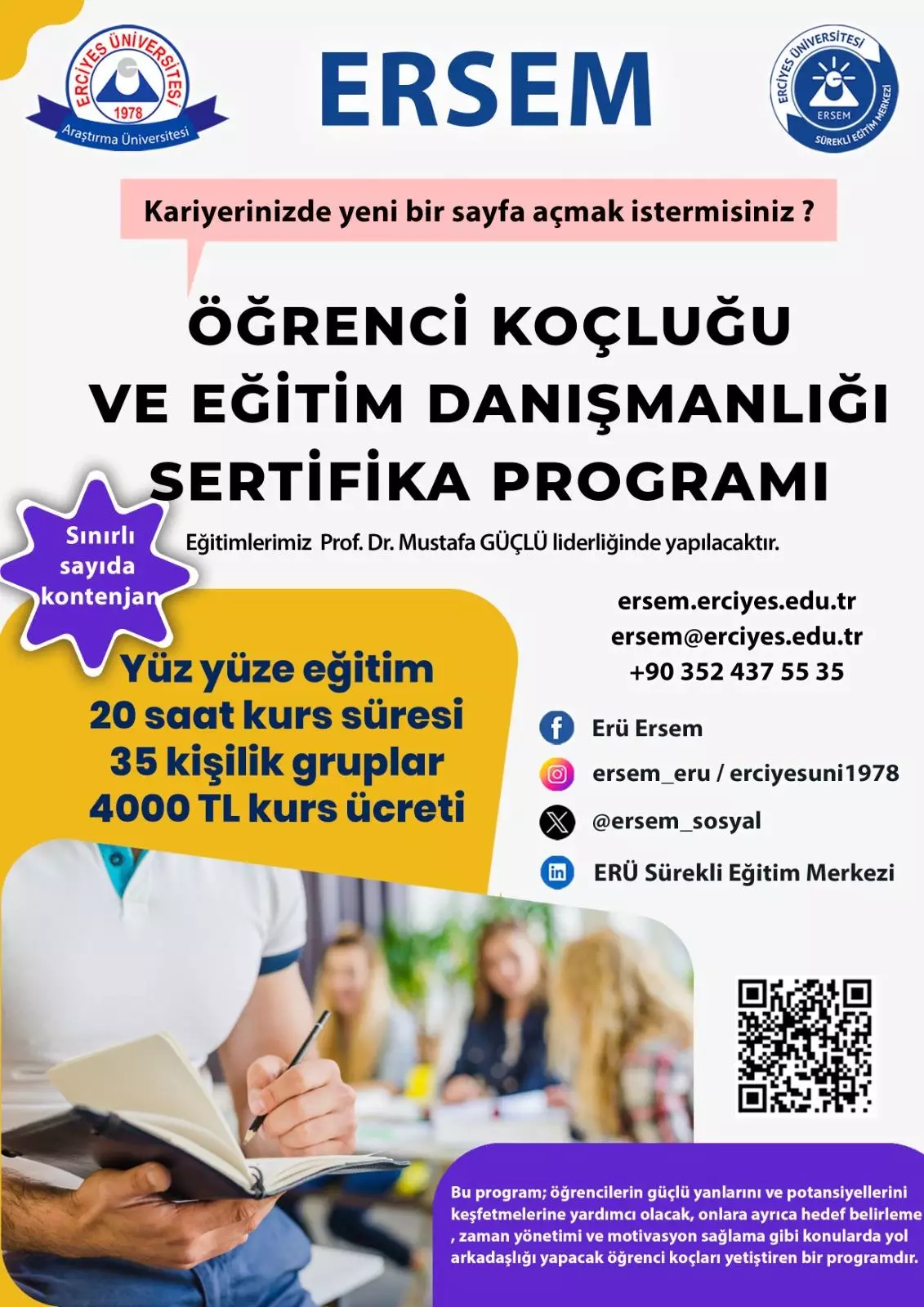 Amaçları: Bu eğitimin amacı, öğrencilerin akademik başarılarını arttırmak için verilebilecek planlama, zaman yönetimi, motivasyon,zihinsel farkındalık,zihinsel gelişim,kuantum öğrenme vb. konularda destekler verebilecek yetkin bireyler yetiştirmek.