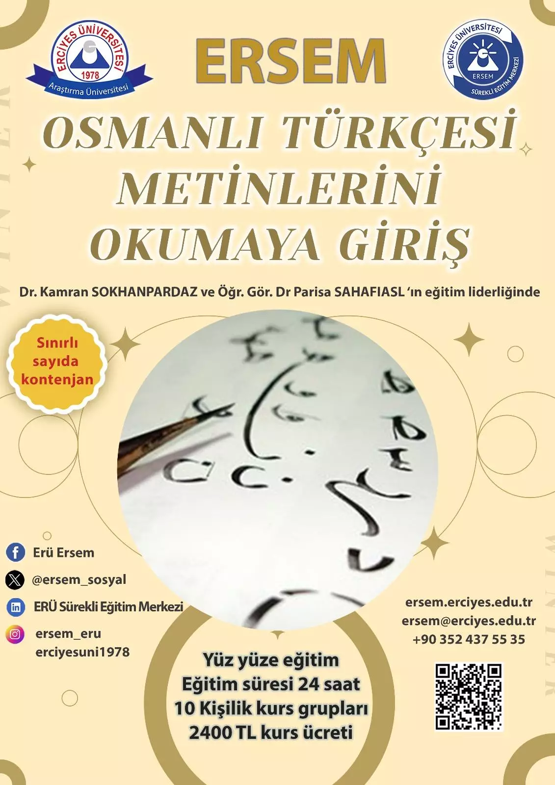 Tanımı: Bu kurs, Osmanlı Türkçesinin temel alfabe ve gramer yapısını öğretmeyi, Arap harfleriyle yazılmış metinlerin okunması ve anlaşılmasını sağlamayı amaçlamaktadır. Katılımcılar, dönemin belgeleri, kitabeleri ve edebî metinleri üzerinde uygulamalı okuma çalışmaları yapacaklardır.